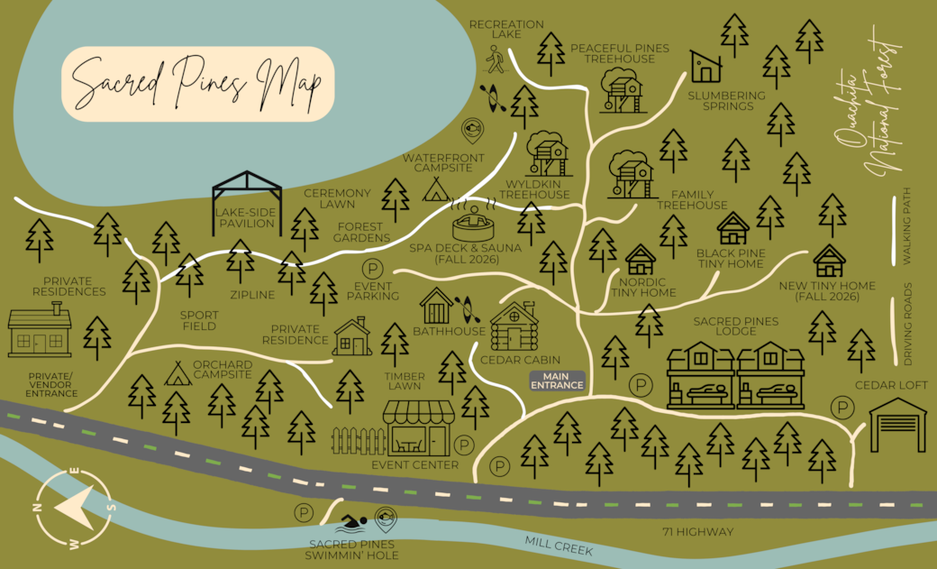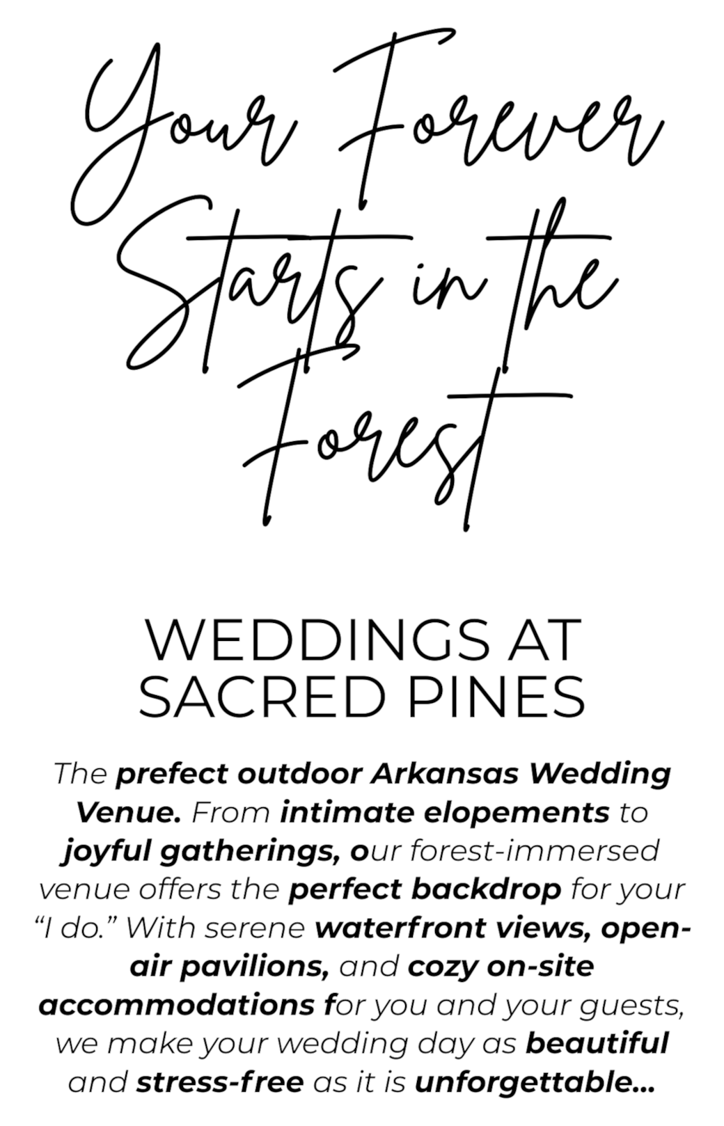 Sacred Pines is a 5-star forest getaway and venue where connection, adventure, and celebration meet on 75 acres in the heart of the Ouachitas in West Arkansas.