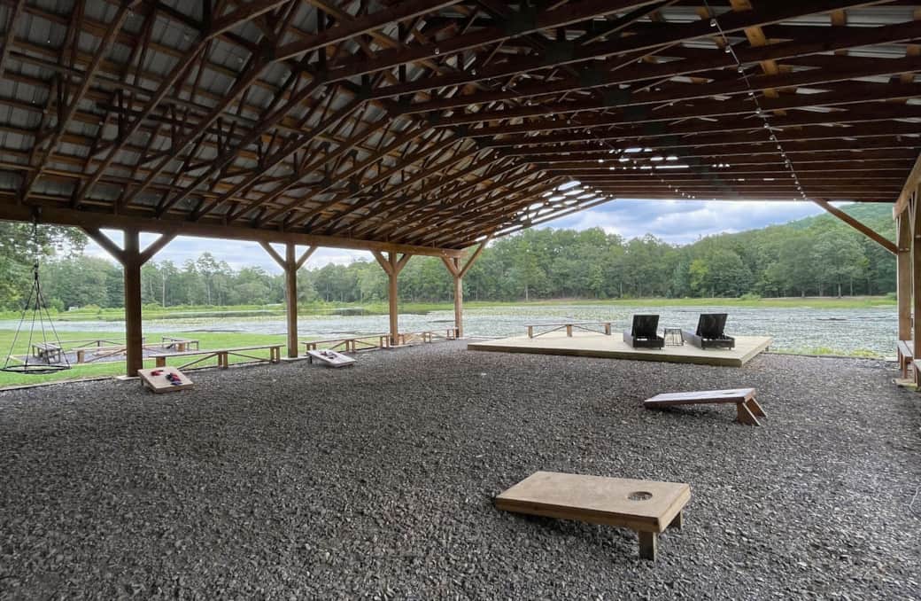 Gather under our covered pavilion—complete with cozy seating, outdoor lighting, lawn games, and a shared fire pit that brings guests together.